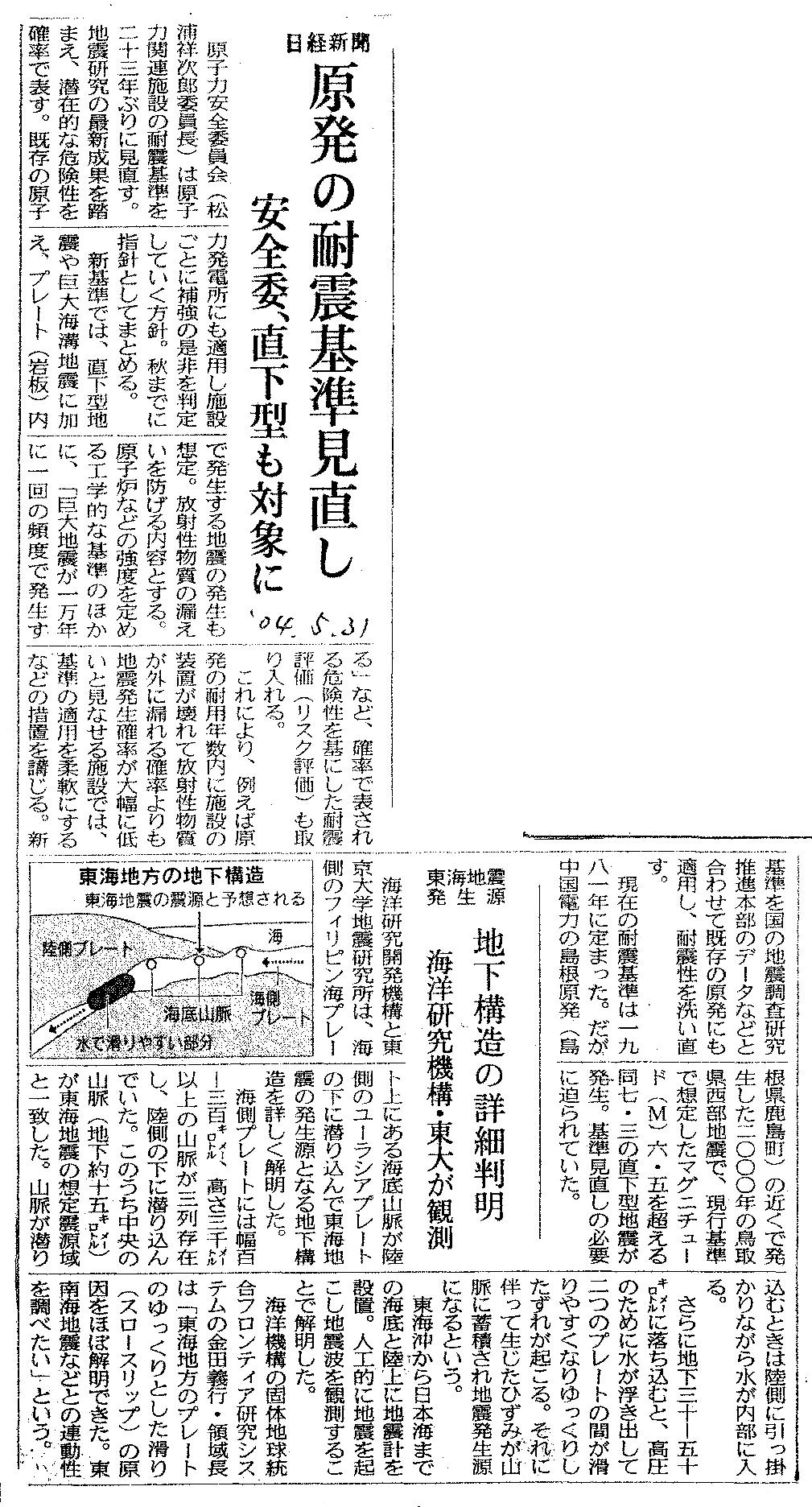 | [2004_05_31_01]原発の耐震基準見直し 安全委、直下型も対象に 東海地震発生源 地下構造の詳細判明 海洋研究機構・東大が観測(日経新聞2004年5月31日) |