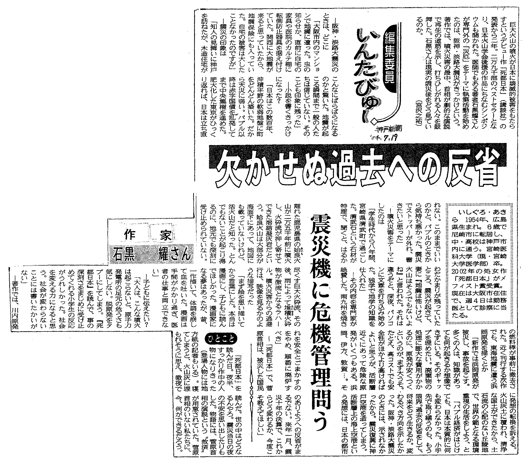 [2004_07_19_01]編集委員 いんたびゅー 欠かせぬ過去への反省 震災機に危機管理問う 作家 石黒耀(あきら)さん (神戸新聞2004年7月19日)