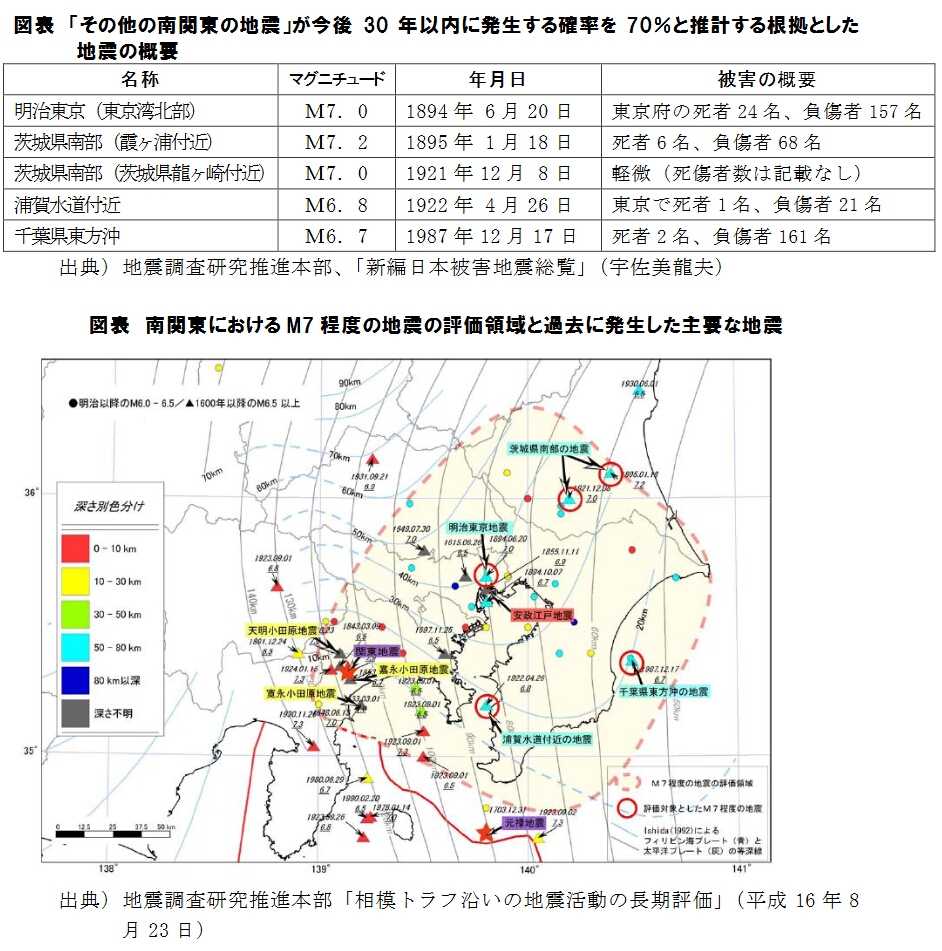 [2004_08_23_01]図表「その他の南関東の地震」が今後30年以内に発生する確率を70%と推計する根拠とした地震の概要_図表 南関東におけるM7程度の地震の評価領域と過去に発生した主要な地震(東京都防災ホームページ2004年8月23日)