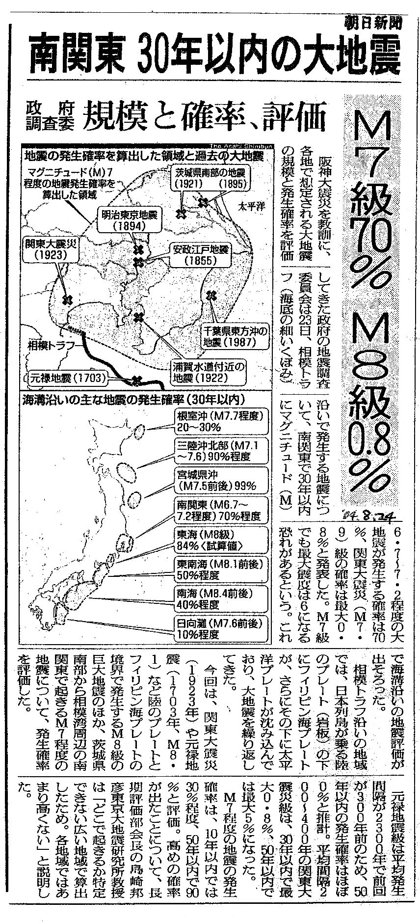 | [2004_08_24_01]南関東 30年以内の大地震 M7級70% M8級0.8% 政府調査委 規模と確率、評価(朝日新聞2004年8月24日) |