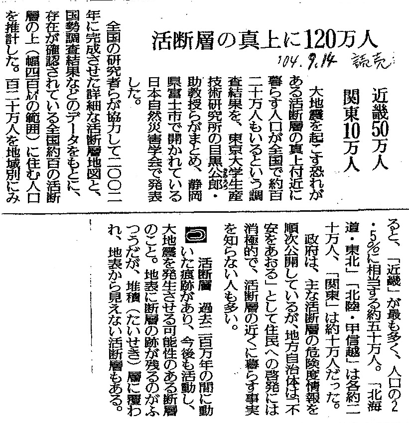 [2004_09_14_01]活断層の真上に120万人 近畿50万人 関東10万人(読売新聞2004年9月14日)