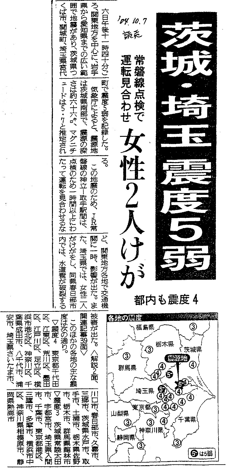 [2004_10_07_01]茨城・埼玉 震度5弱 常磐線点検で運転見合わせ 女性2人けが 都内も震度4(読売新聞2004年10月7日)