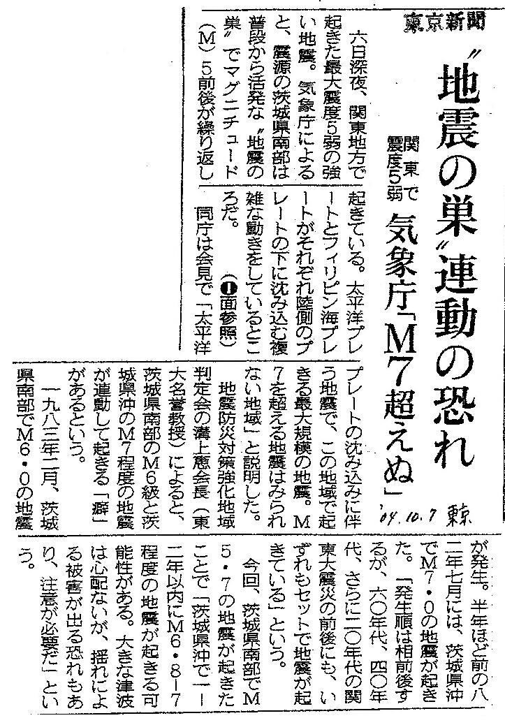 [2004_10_07_02]”地震の巣”連動の恐れ 関東で震度5弱 気象庁「M7超えぬ」(毎日新聞2004年10月7日)