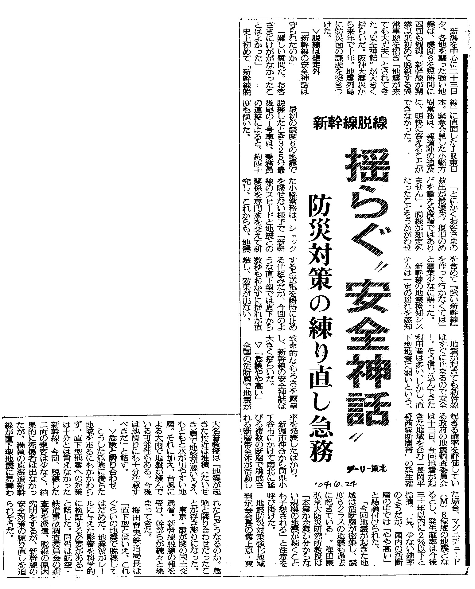 | [2004_10_24_04]新幹線脱線 揺らぐ”安全神話” 防災対策の練り直し急務 脱線は想定外 危険と隣り合わせ(デーリー東北2004年10月24日) |