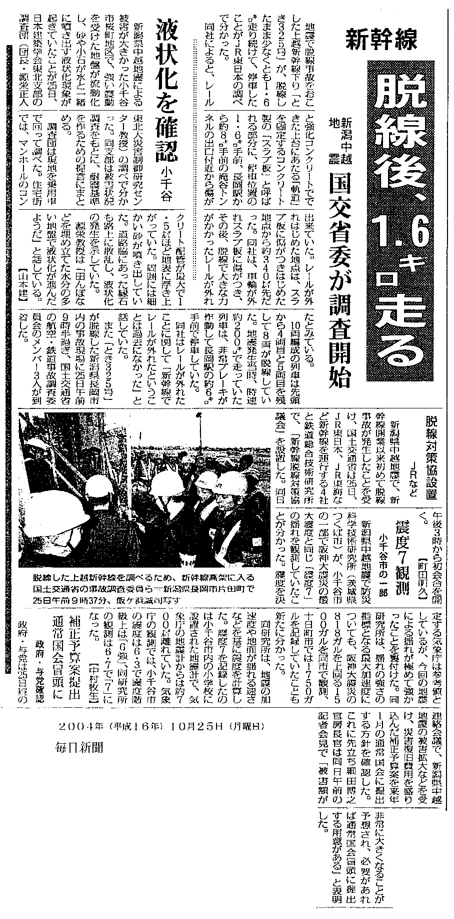 [2004_10_25_01]新幹線 脱線後、1.6キロ走る 新潟中越地震 国交省委が調査開始 液状化を確認 小千谷 脱線対策協設置 JRなど 震度7観測 小千谷市の一部 補正予算案提出 通常国会冒頭に 政府・与党確認(毎日新聞2004年10月25日)