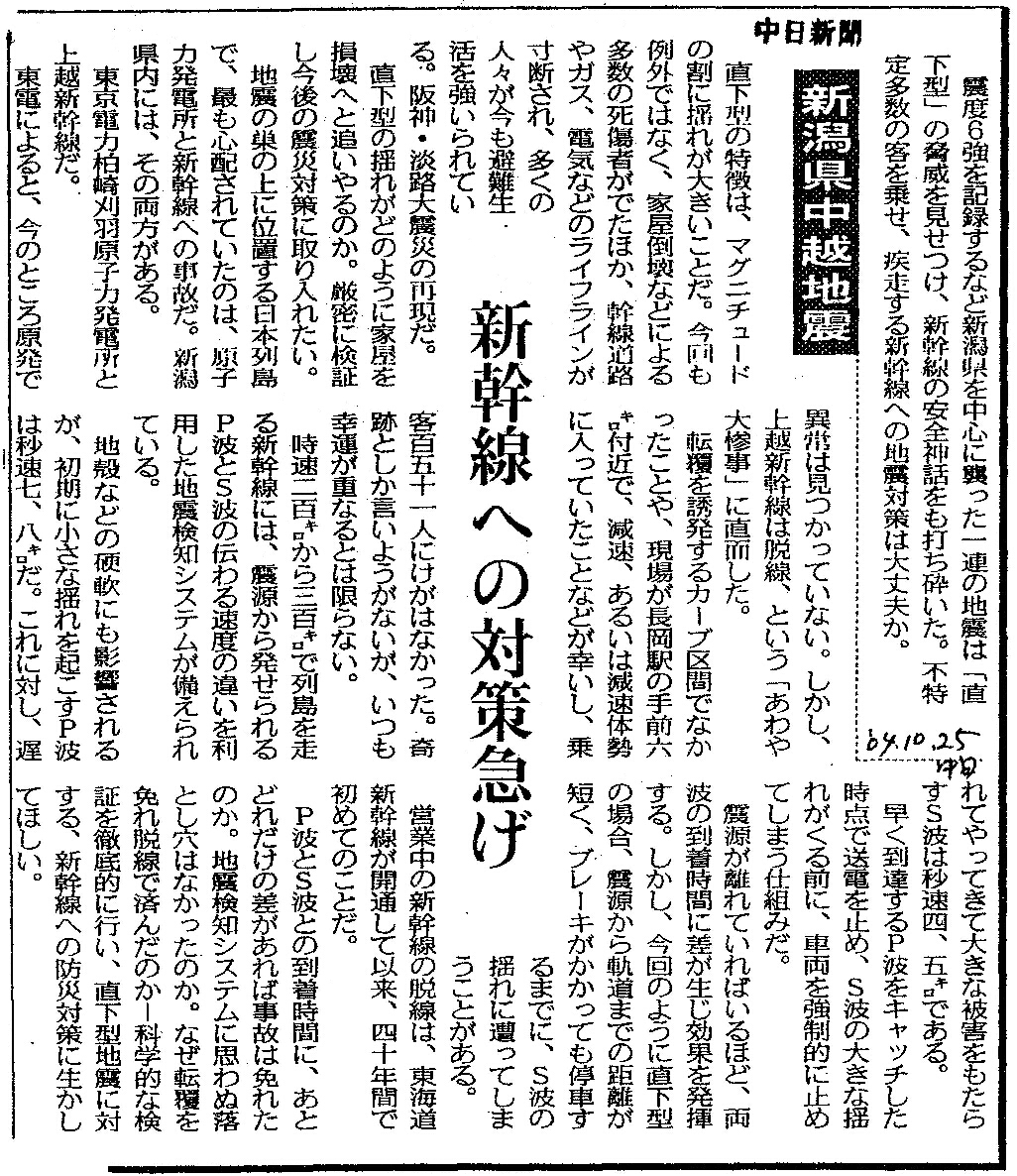 [2004_10_25_03]新潟県中越地震 新幹線への対策急げ(毎日新聞2004年10月25日)