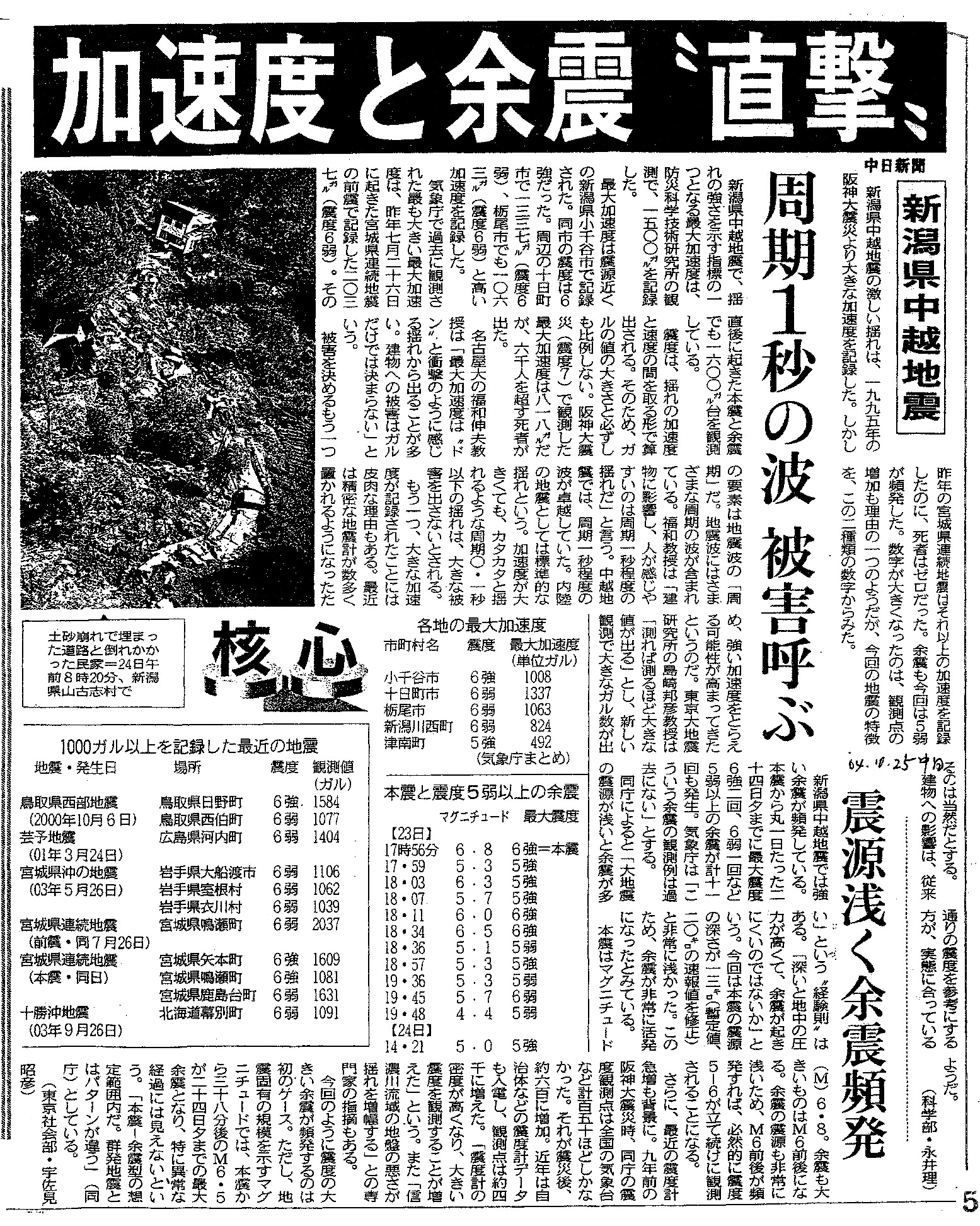 [2004_10_25_06]新潟県中越地震 加速度と余震”直撃” 周期1秒の波 被害呼ぶ 震源浅く余震頻発(中日新聞2004年10月25日)