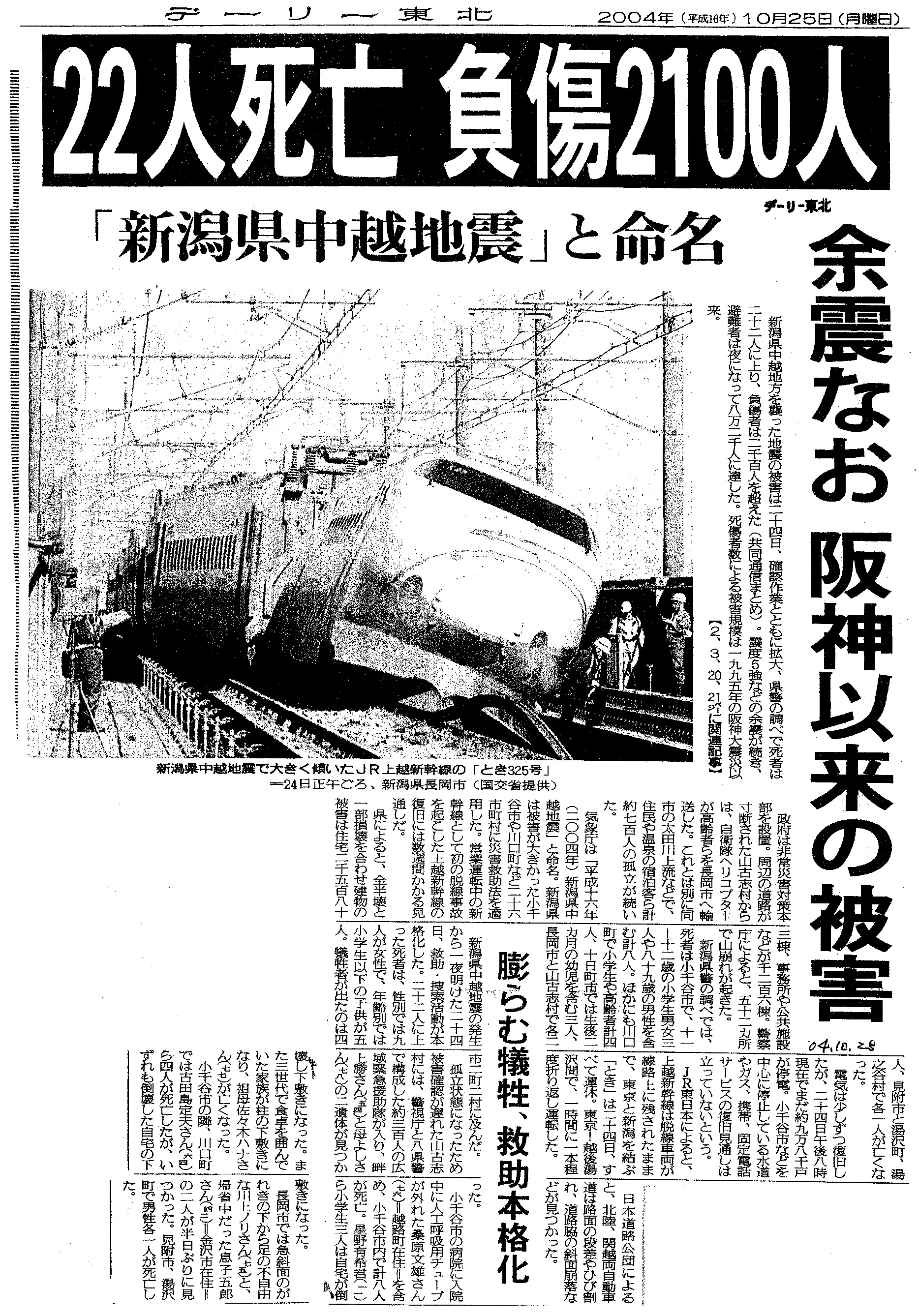 [2004_10_25_07]22人死亡 負傷2100人 「新潟県中越地震」と命名 余震なお 阪神以来の被害 膨らむ犠牲、救助本格化(デーリー東北2004年10月25日)