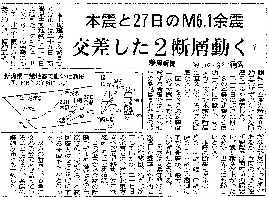 [2004_10_30_01]本震と27日のM6.1余震 交差した2断層動く?(静岡新聞2004年10月30日)