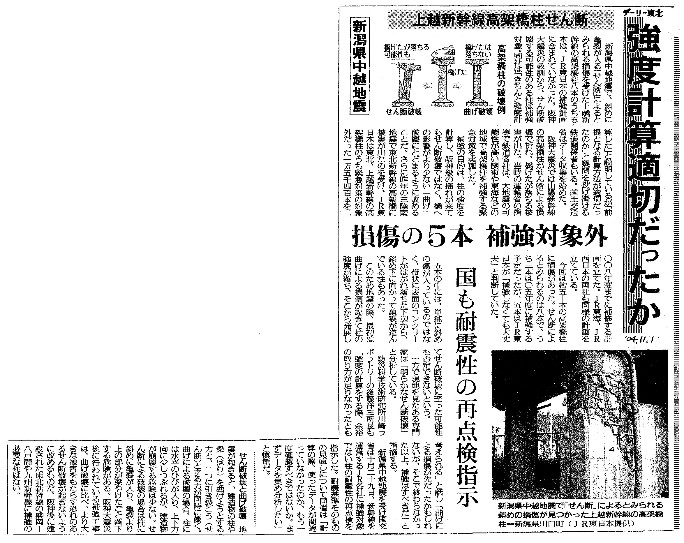 [2004_11_01_01]新潟県中越地震 上越新幹線高架橋柱せん断 強度計算適切だったか 損傷の5本 補強対象外 国も耐震性の再点検指示 せん断破壊と曲げ破壊(デーリー東北2004年11月1日)