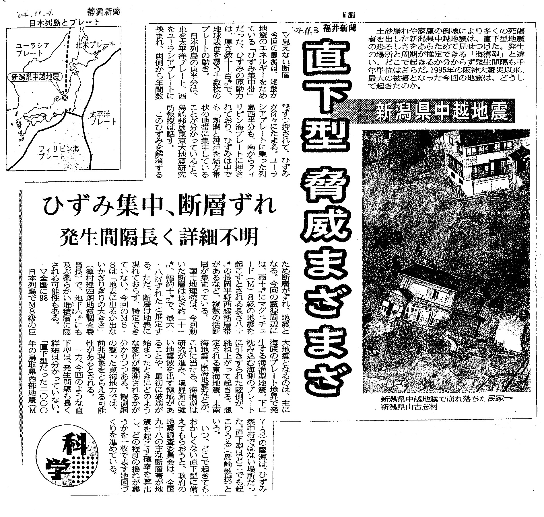 | [2004_11_03_01]新潟県中越地震 直下型 脅威まざまざ ひずみ集中、断層ずれ 発生間隔長く詳細不明(福井新聞2004年11月3日) |