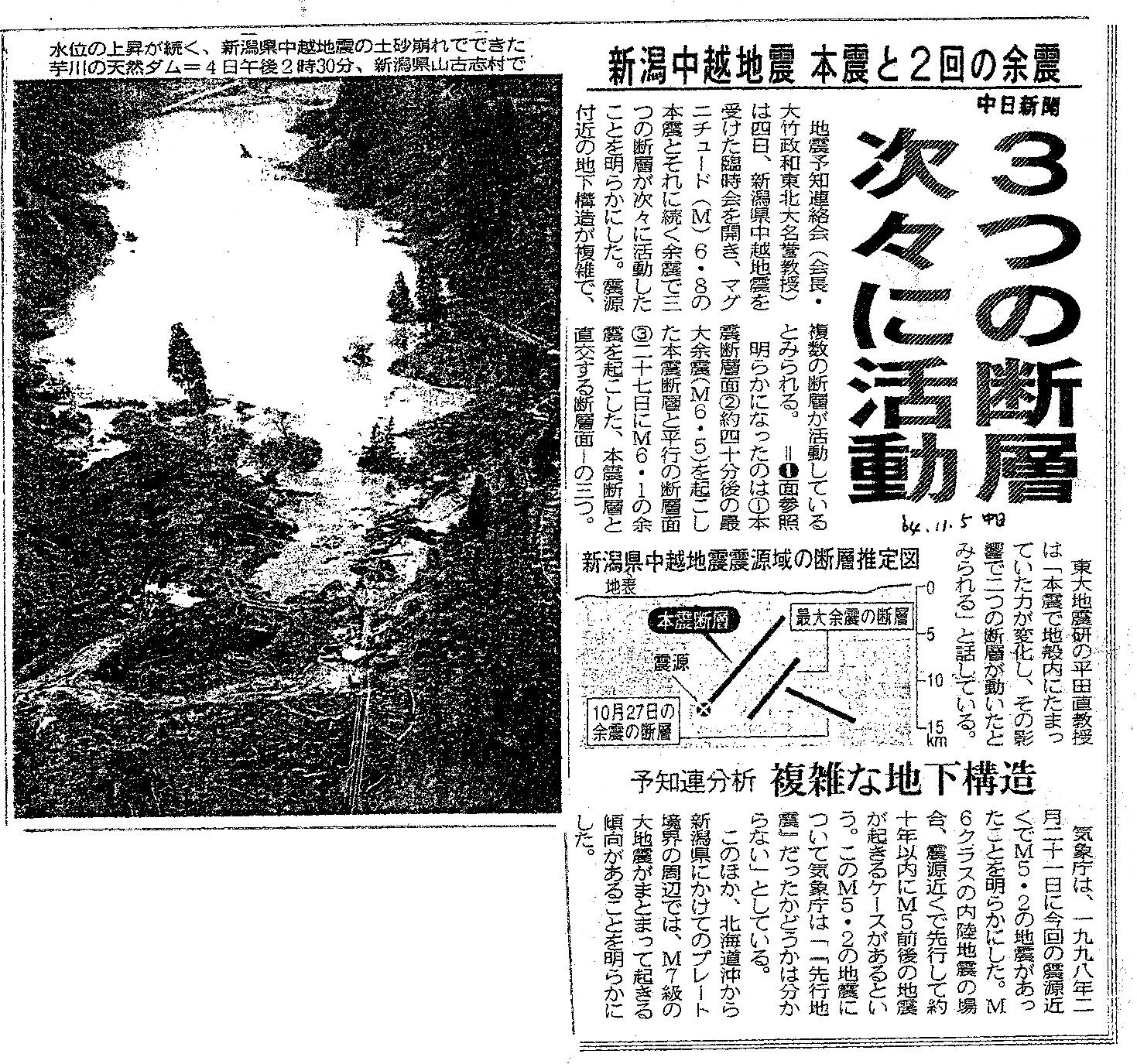 [2004_11_05_02]新潟中越地震 本震と2回の余震 3つの断層 次々に活動 予知連分析 複雑な地下構造(中日新聞2004年11月5日)