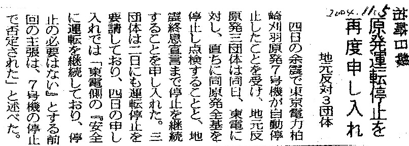 [2004_11_05_03]原発運転停止を再度申し入れ 地元反対3団体(柏崎日報2004年11月5日)