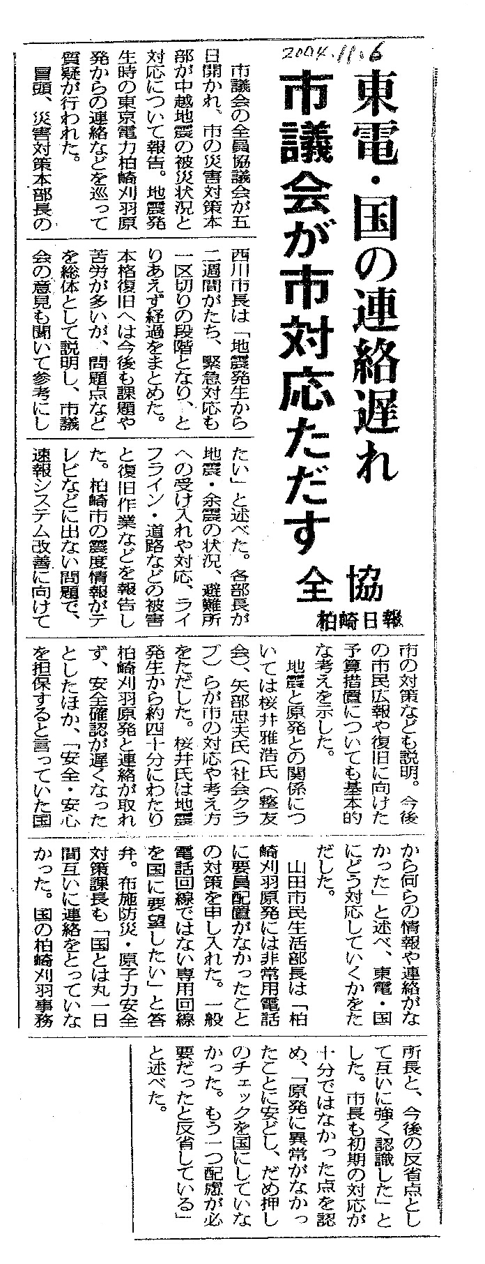 [2004_11_06_01]東電・国の連絡遅れ 市議会が市対応ただす 全協(柏崎日報2004年11月6日)