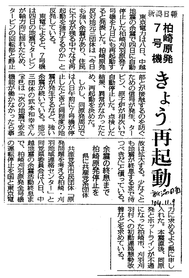 [2004_11_09_01]柏崎原発7号機 きょう再起動 余震の終息まで柏崎原発停止を 県に共産党系団体(新潟日報2004年11月9日)