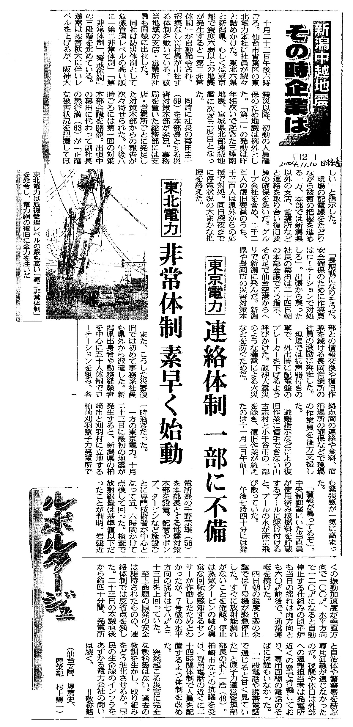 [2004_11_10_01]新潟中越地震 その時企業は 東北電力 非常体制素早く始動 東京電力 連絡体制一部に不備(日経新聞2004年11月10日)