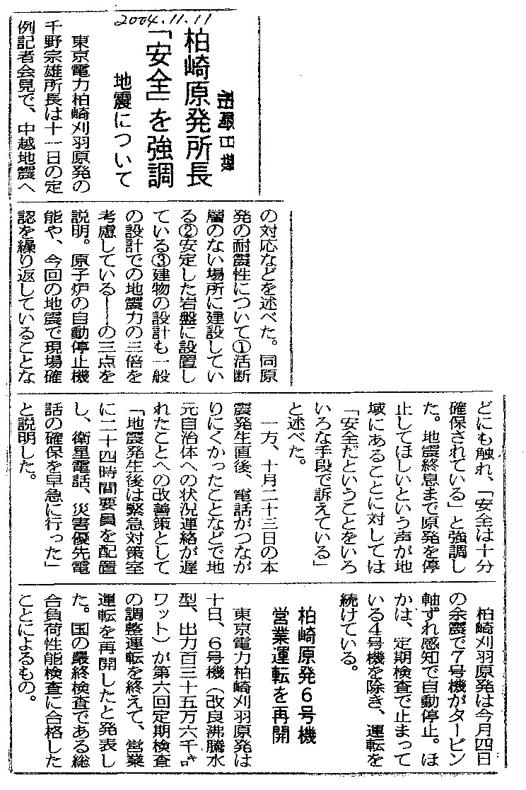 [2004_11_11_01]柏崎原発所長 「安全」を強調 地震について 柏崎原発6号機営業運転を再開(柏崎日報2004年11月11日)