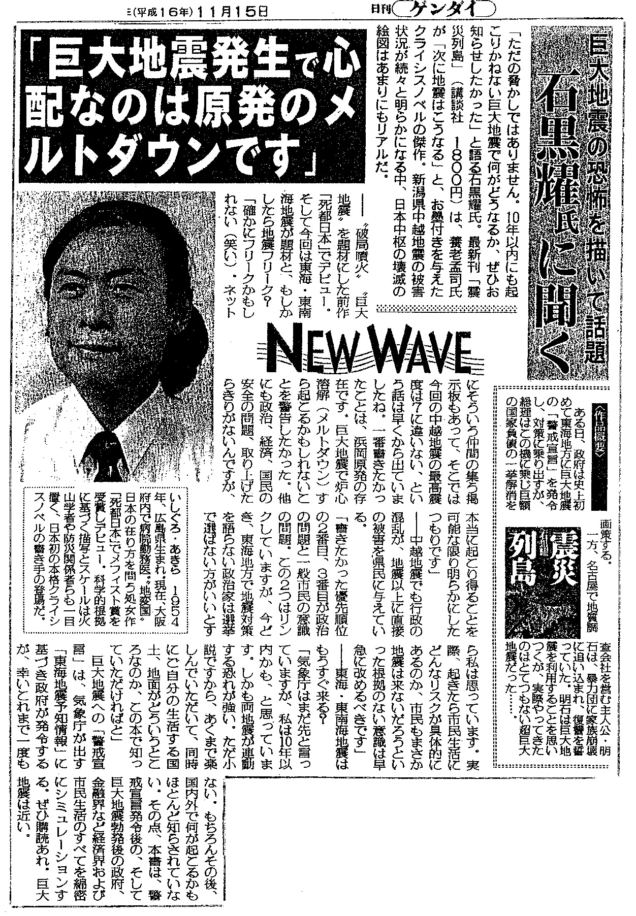 [2004_11_15_01]巨大地震の恐怖を描いて話題 石黒耀氏に聞く 「巨大地震発生で心配なのは原発のメルトダウンです」(日刊ゲンダイ2004年11月15日)