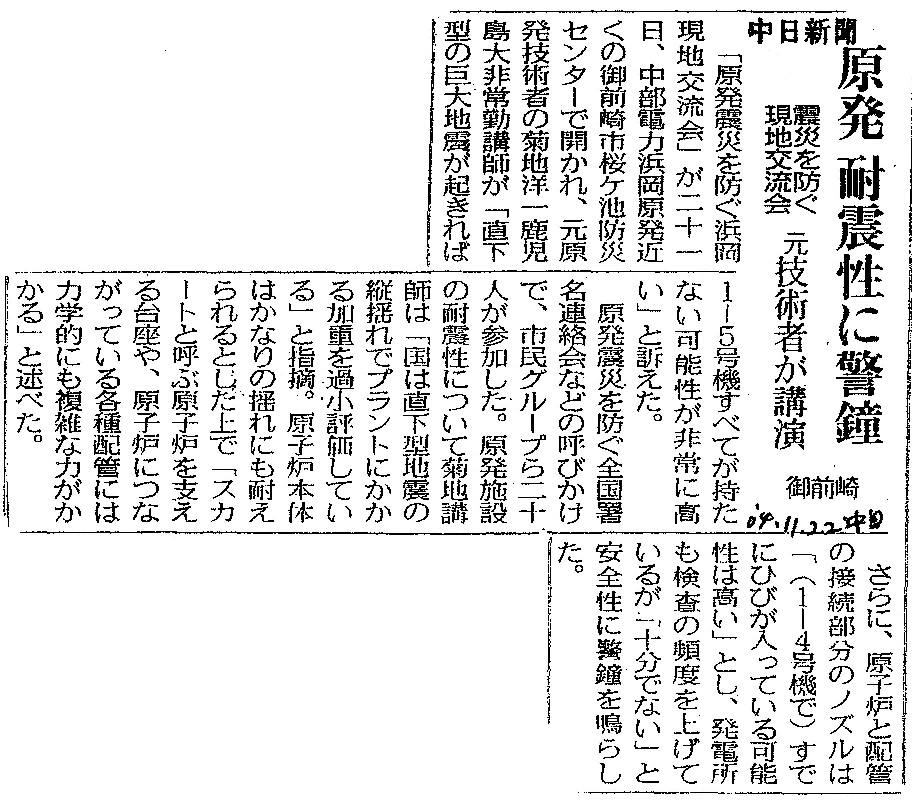 [2004_11_22_01]原発 耐震性に警鐘 震災を防ぐ現地交流会 元技術者が講演 御前崎(中日新聞2004年11月22日)
