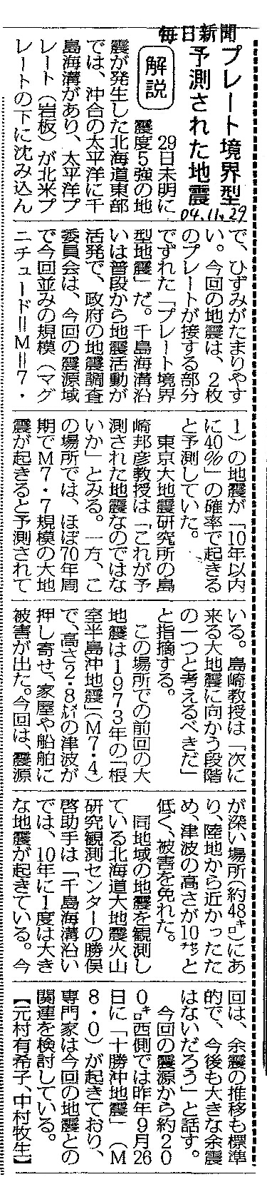 | [2004_11_29_01]プレート境界型 予測された地震(毎日新聞2004年11月29日) |