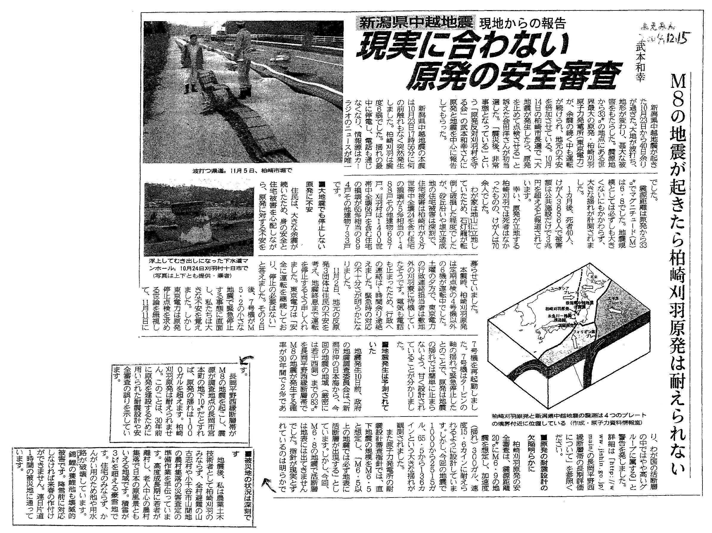 | [2004_12_15_01]新潟県中越地震 現地からの報告 現実に合わない原発の安全審査 武本和幸 M8の地震が起きたら柏崎刈羽原発は耐えられない 大地震でも停止しない原発に不安 地震発生は予測されていた 原発の耐震設計の欠陥明らかに 被災地の状況は深刻です(ふえみん2004年12月15日) |