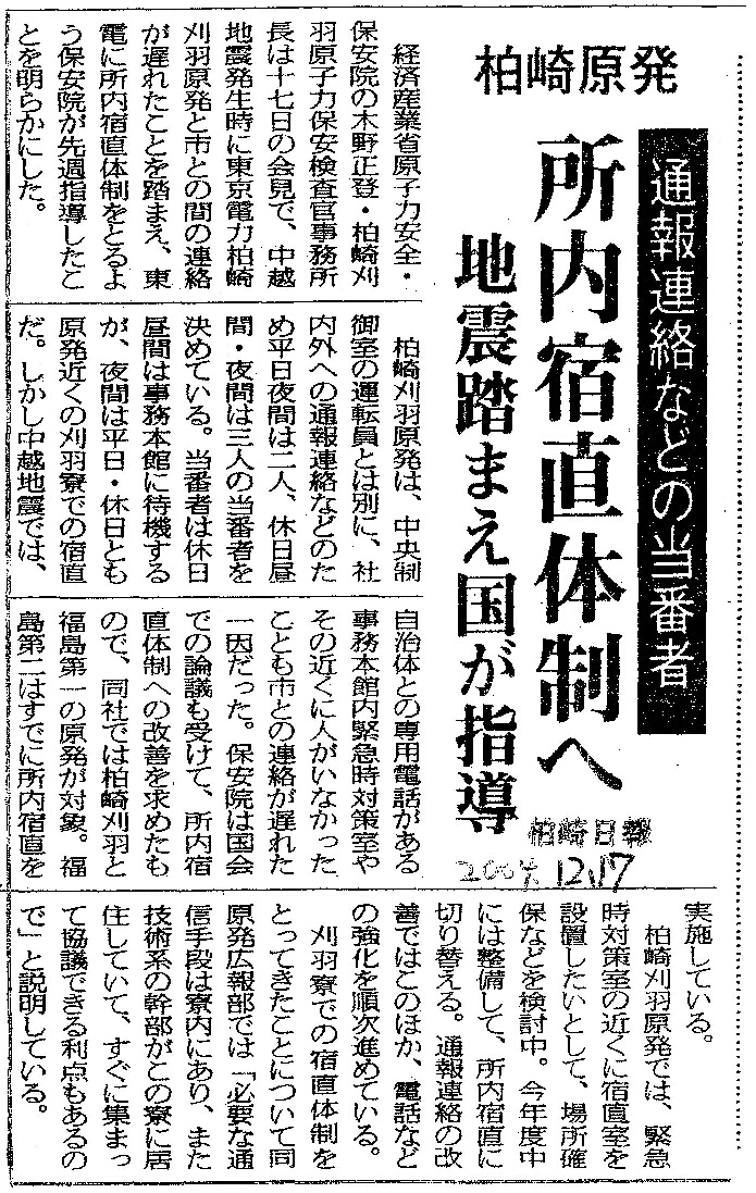 [2004_12_17_01]柏崎原発 通報連絡などの当番者 所内宿直体制へ 地震踏まえ国が指導(柏崎日報2004年12月17日)