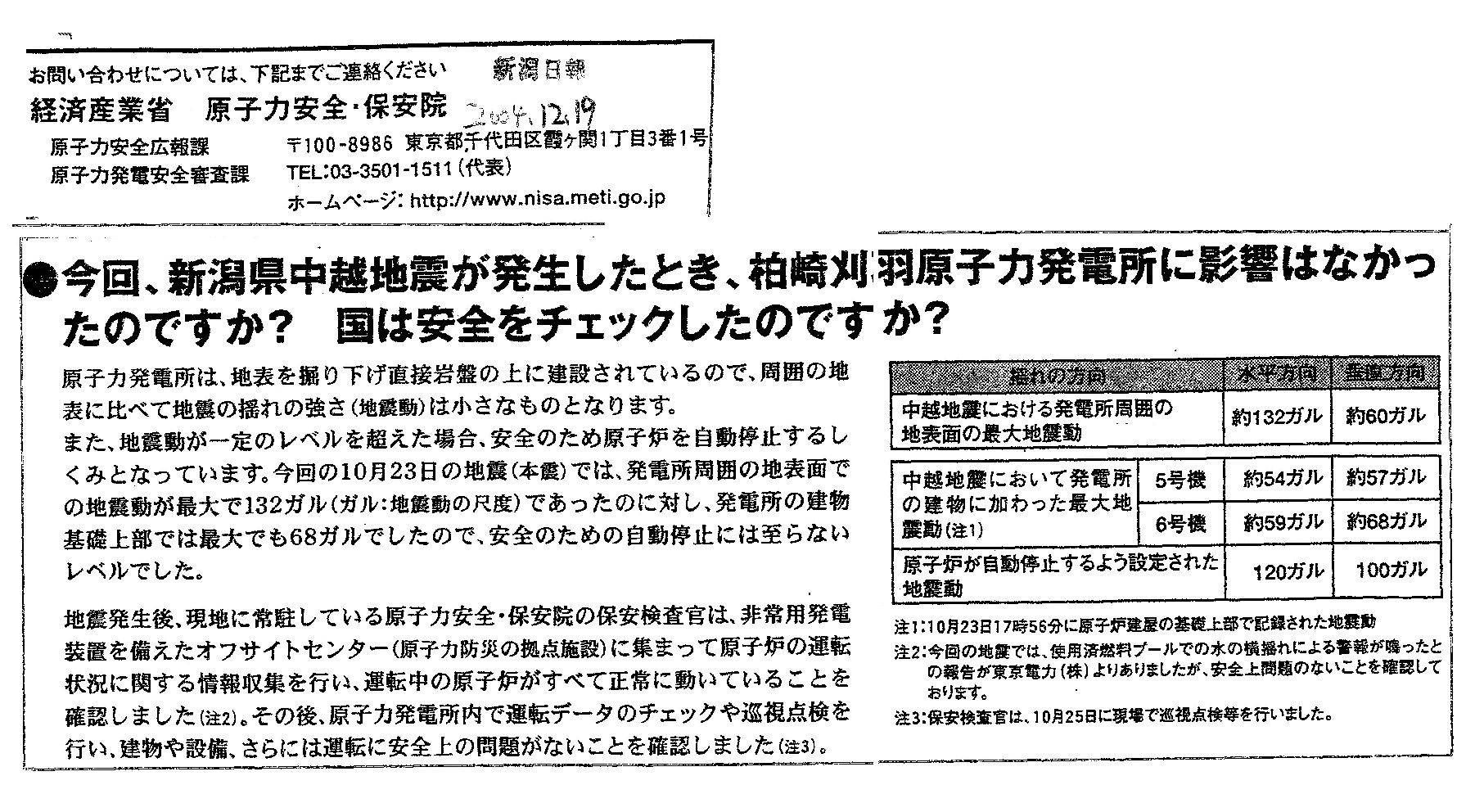 [2004_12_19_01]今回、新潟県中越地震が発生したとき、柏崎刈羽原子力発電所に影響はなかったのですが?国は安全をチェックしたのですか? 経済産業省 原子力安全・保安院(新潟日報2004年12月19日)