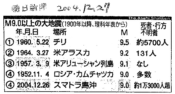 [2004_12_27_04]M9.0以上の大地震(1900年以降、理科年表から)(朝日新聞2004年12月27日)
