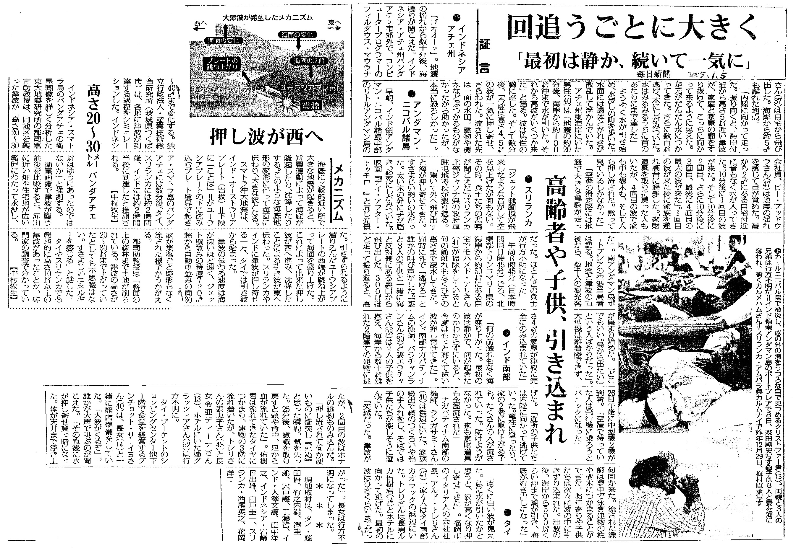[2005_01_05_01]証言 回追うごとに大きく 「最初は静か、続いて一気に」 インドネシアアチェ州 アンダマン・ニコバル諸島 スリランカ インド南部 タイ メカニズム 押し波が西へ 高さ20〜30メートル バンダアチェ(毎日新聞2005年1月5日)