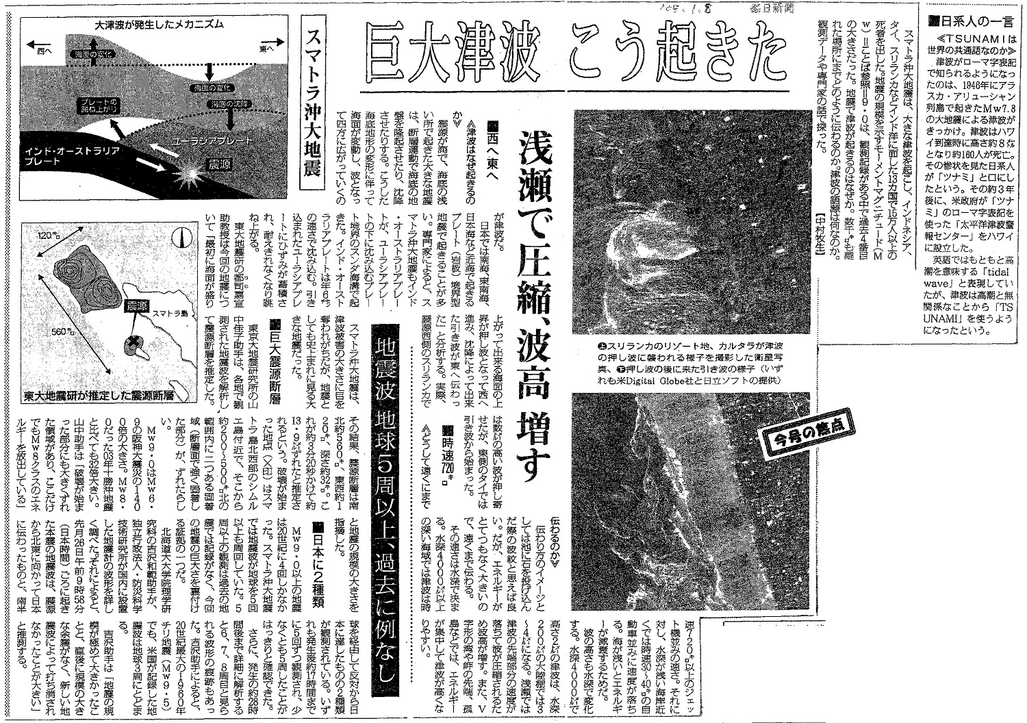 | [2005_01_08_02]スマトラ沖大地震 巨大津波 こう起きた 浅瀬で圧縮、波高 増す 西へ東へ 時速720キロ 巨大震源断層 日本に2種類 地震波 地球5周以上、過去に例なし (毎日新聞2005年1月8日) |