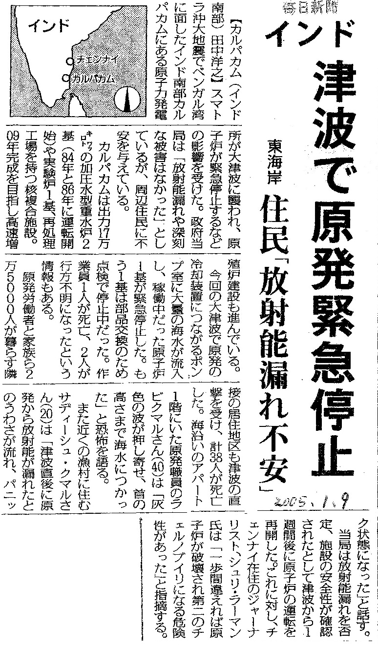 | [2005_01_09_01]インド 津波で原発緊急停止 東海岸 住民「放射能漏れ不安」(毎日新聞2005年1月9日) |