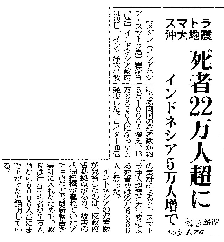 [2005_01_20_01]スマトラ沖大地震 死者22万人超に インドネシア5万人増で(毎日新聞2005年1月20日)