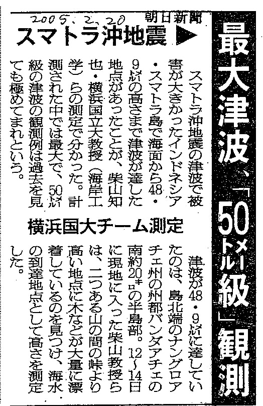 | [2005_02_20_01]スマトラ沖地震 最大津波、「50メートル級」観測 横浜国大チーム測定(朝日新聞2005年2月20日) |