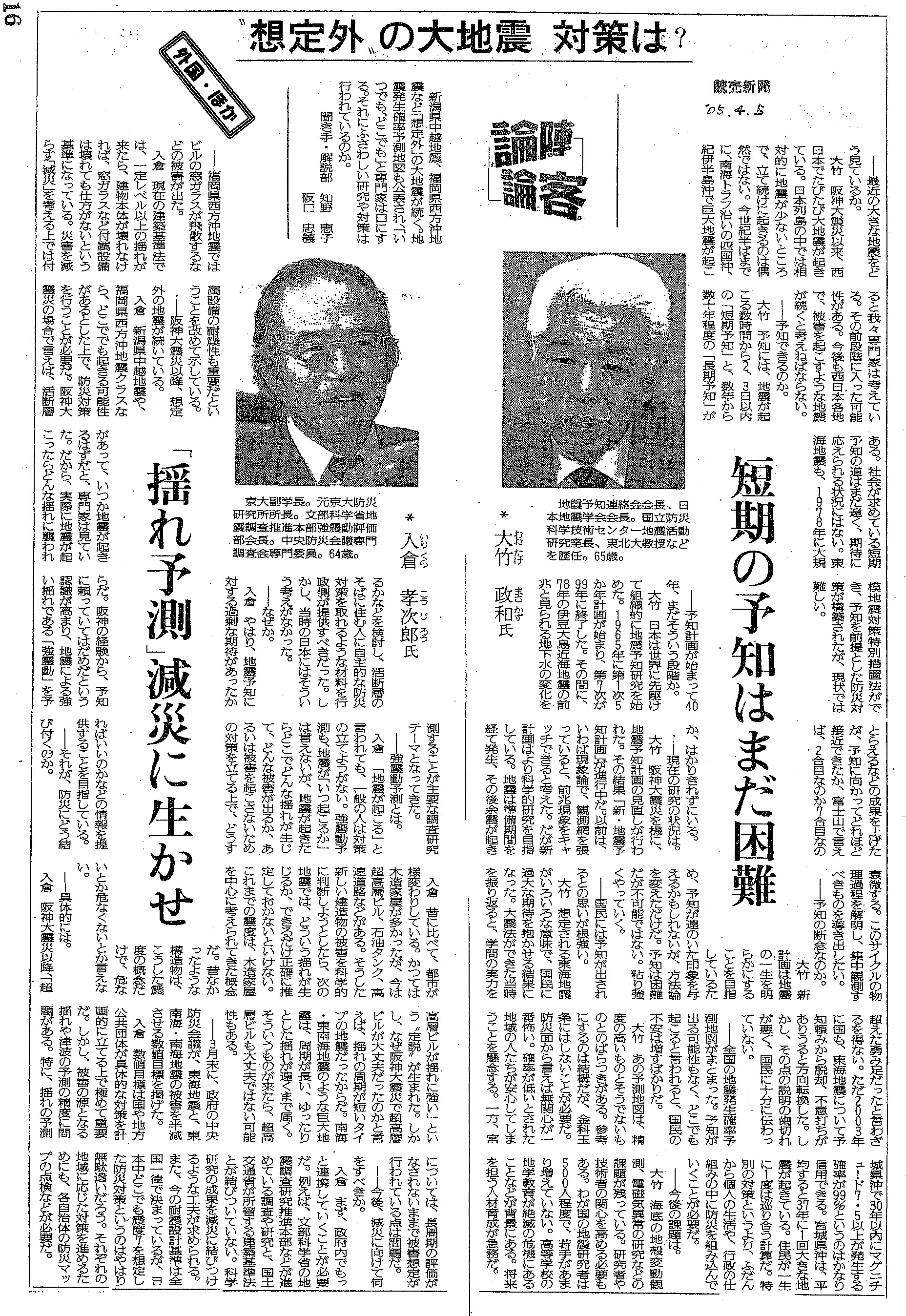 | [2005_04_05_01]論陣論客 ”想定外”の大地震 対策は? 「揺れ予測」減災に生かせ 入倉孝次郎氏 短期の予知はまだ困難 大竹政和氏(読売新聞2005年4月5日) |