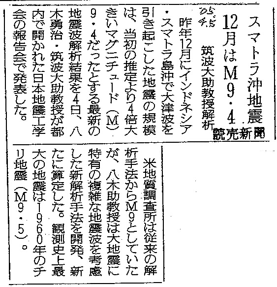 [2005_04_05_02]スマトラ沖地震 12月はM9.4 筑波大助教授解析(読売新聞2005年4月5日)
