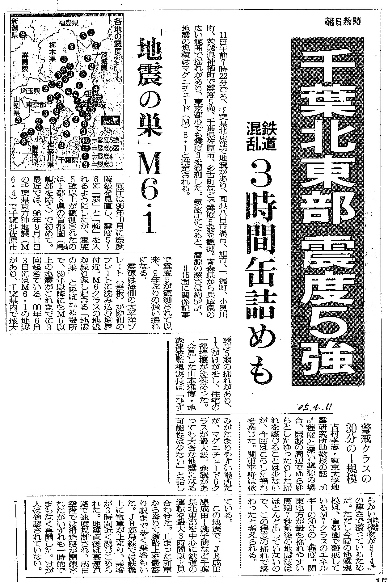[2005_04_11_01]千葉北東部 震度5強 鉄道混乱 3時間缶詰めも 「地震の巣」M6.1 警戒クラスの30分の1規模 古村孝志・東京大学地震研究所助教授の話(朝日新聞2005年4月11日)