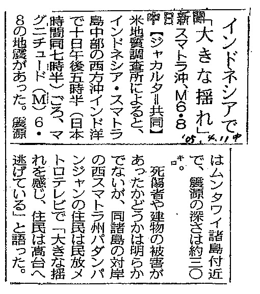 [2005_04_11_02]インドネシアで「大きな揺れ」 スマトラ沖、M6.8(中日新聞2005年4月11日)