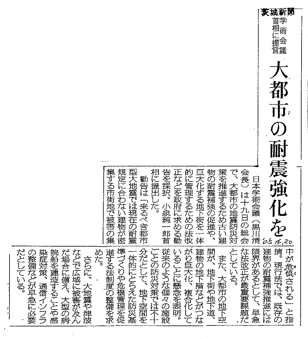 [2005_04_20_02]学術会議 首相に提言 大都市の耐震強化を(茨城新聞2005年4月20日)