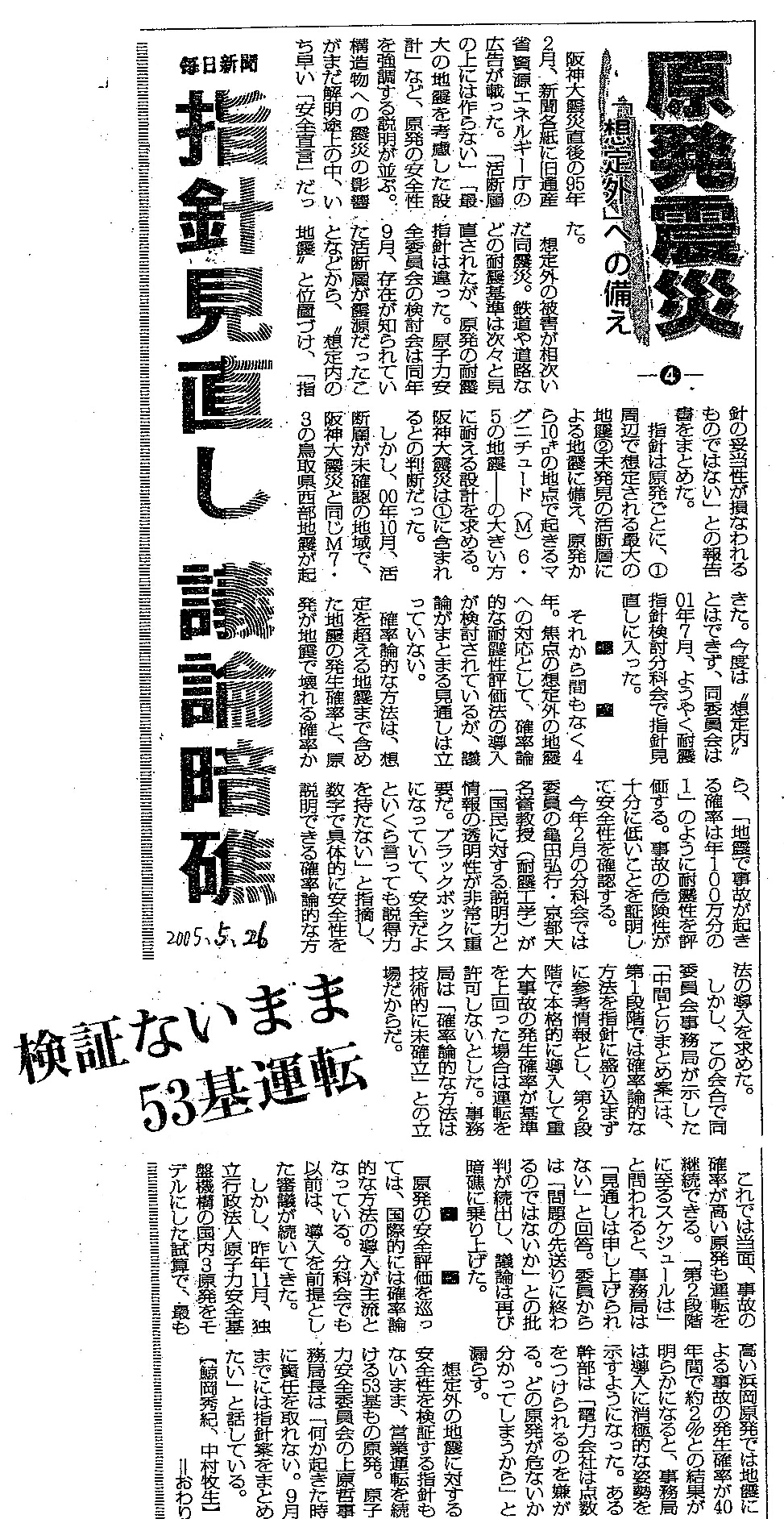 [2005_05_26_01]原発震災 「想定外」への備え 指針見直し 議論暗礁(毎日新聞2005年5月26日)