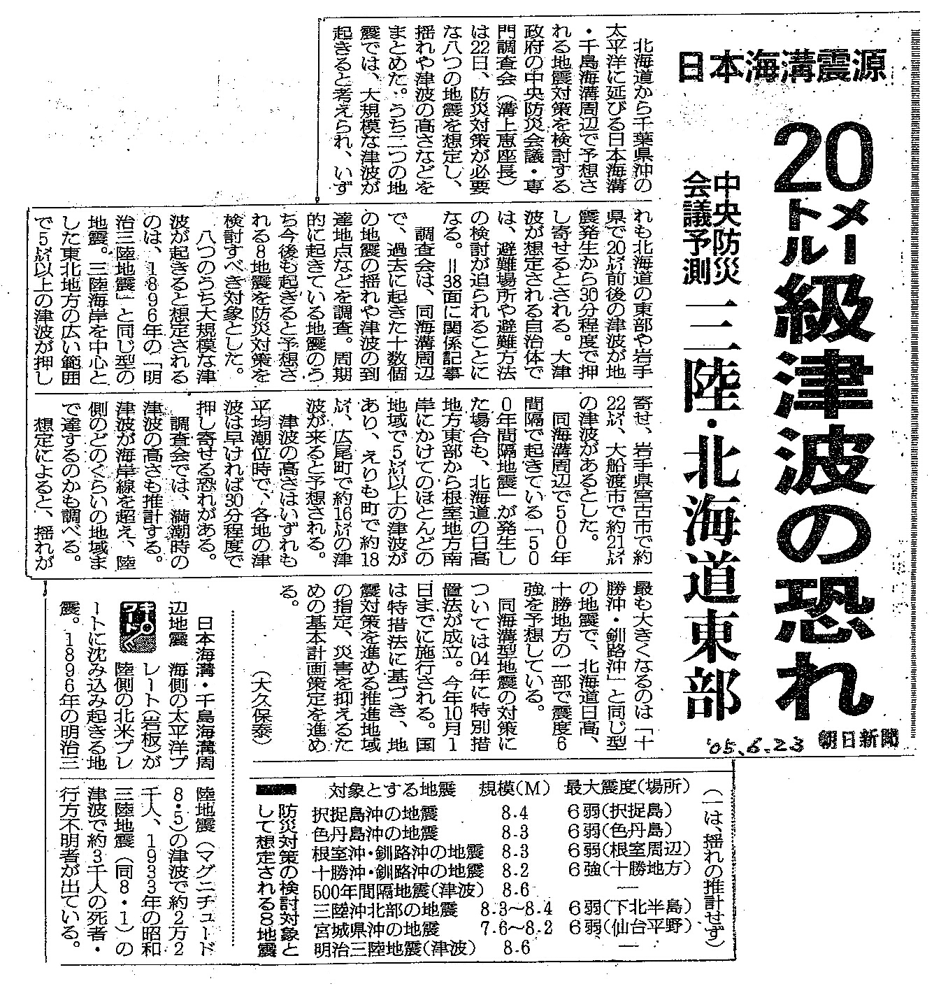 | [2005_06_23_01]日本海溝震源 20メートル級津波の恐れ 中央防災会議予測 三陸・北海道東部(朝日新聞2005年6月23日) |