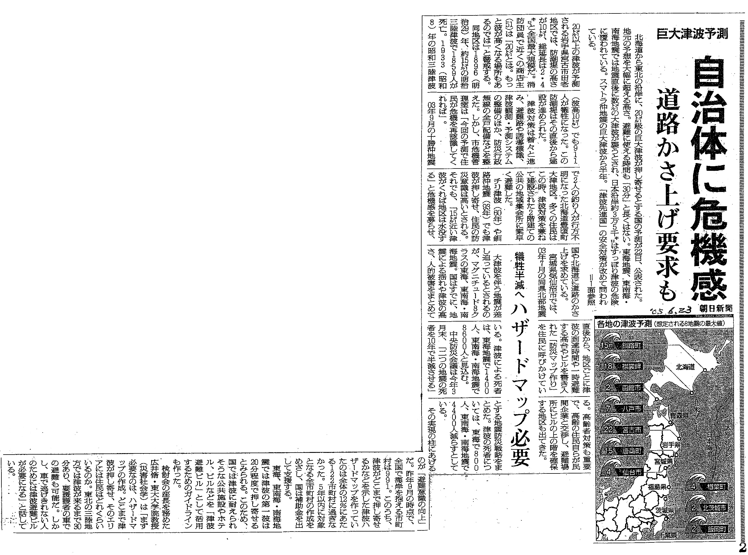 [2005_06_23_02]巨大津波予測 自治体に危機感 道路かさ上げ要求も 犠牲半減へ ハザードマップ必要(朝日新聞2005年6月23日)