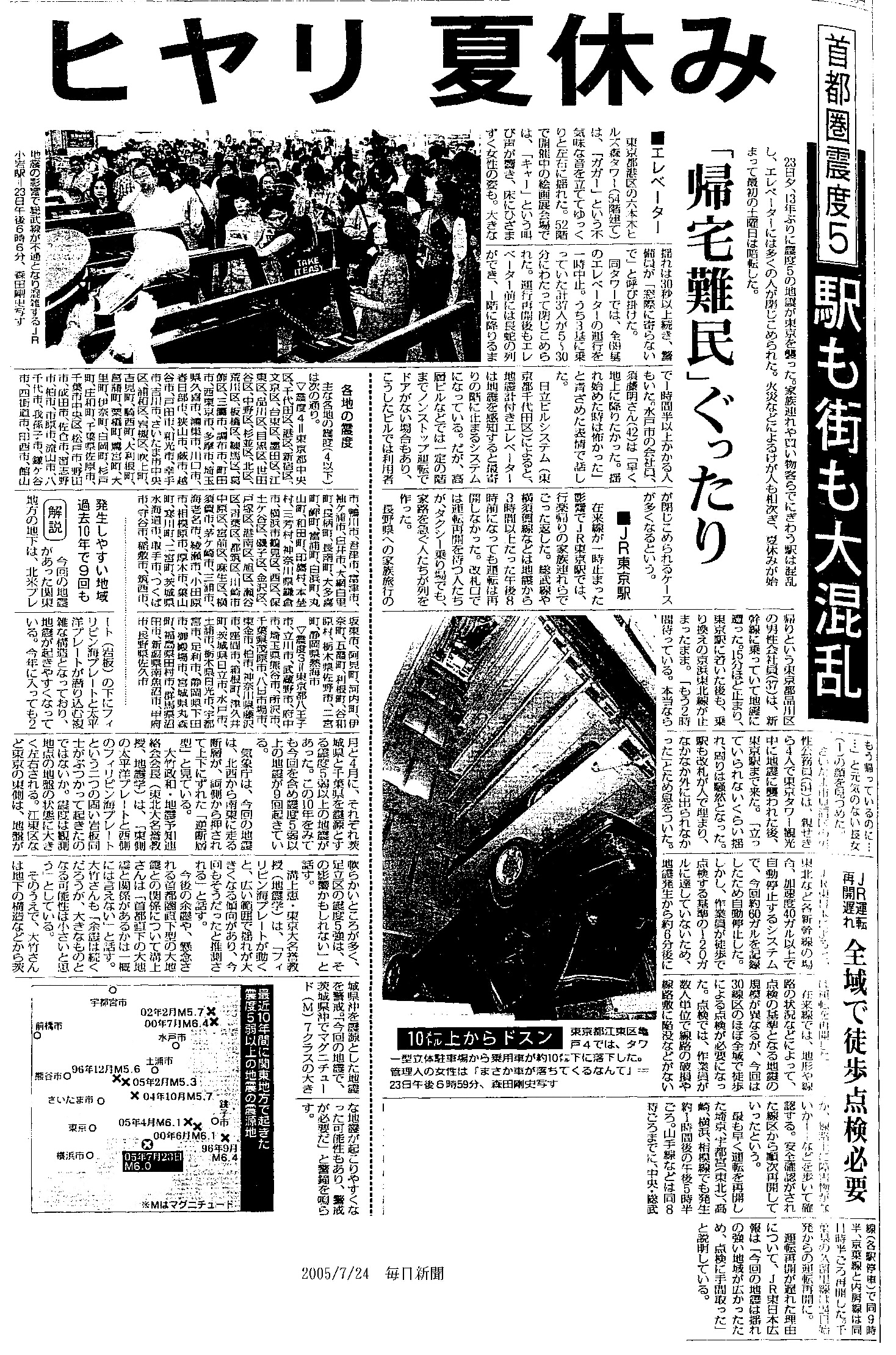 [2005_07_24_01]ヒヤリ 夏休み 首都圏震度5 駅も街も大混乱 「帰宅難民」ぐったり エレベーター JR東京駅 JR運転再開遅れ 全域で徒歩点検必要 10メートル上からドスン 各地の震度 発生しやすい地域 過去10年で9回も(毎日新聞2005年7月24日)