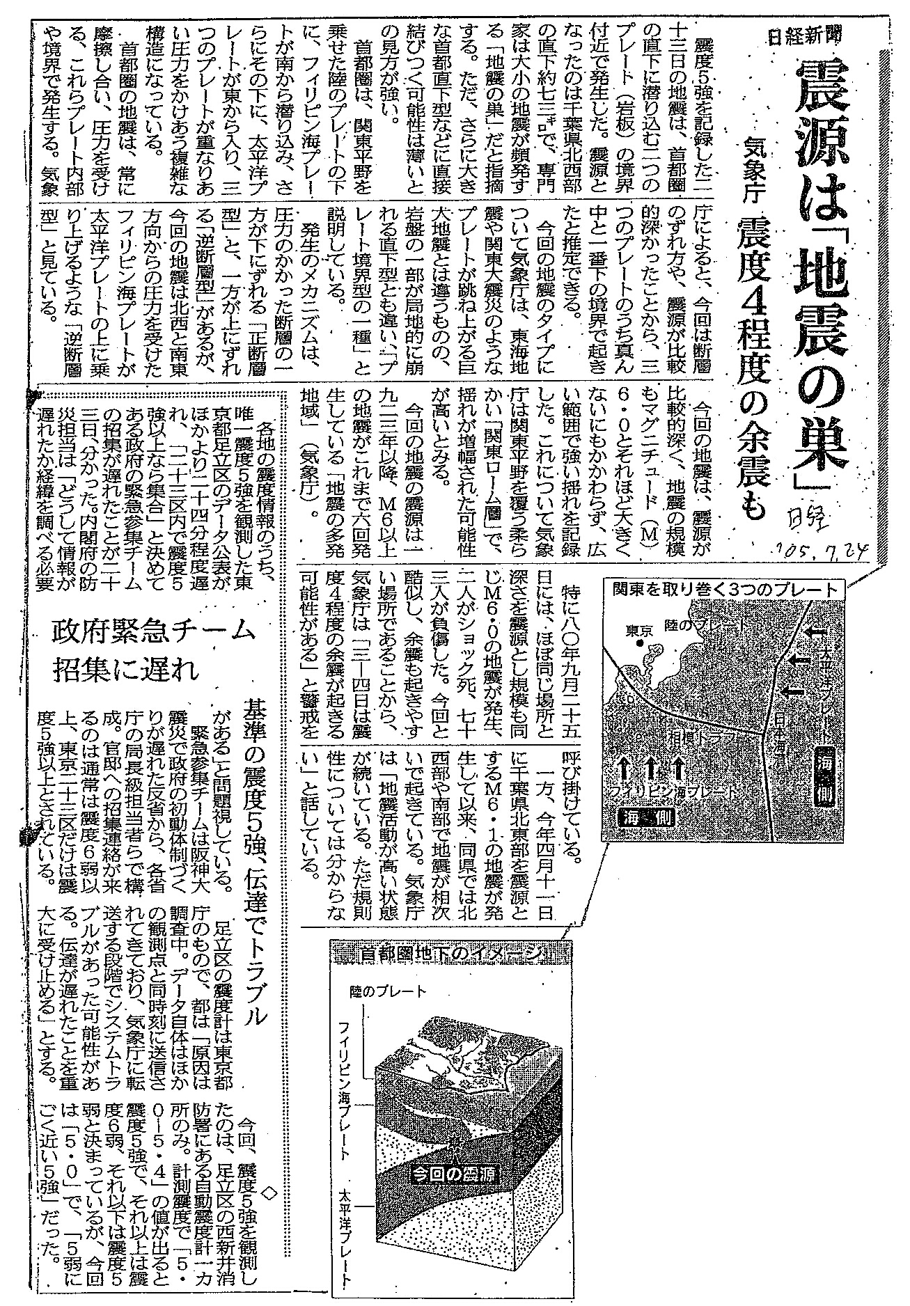 [2005_07_24_03]震源は「地震の巣」 気象庁 震度4程度の余震も 政府緊急チーム招集に遅れ 基準の震度5強、伝達でトラブル(日経新聞2005年7月24日)