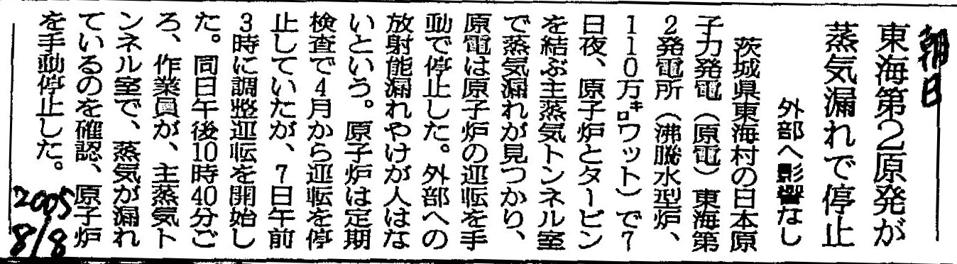 [2005_08_08_01]東海第2原発が蒸気漏れで停止 外部へ影響なし(朝日新聞2005年8月8日)