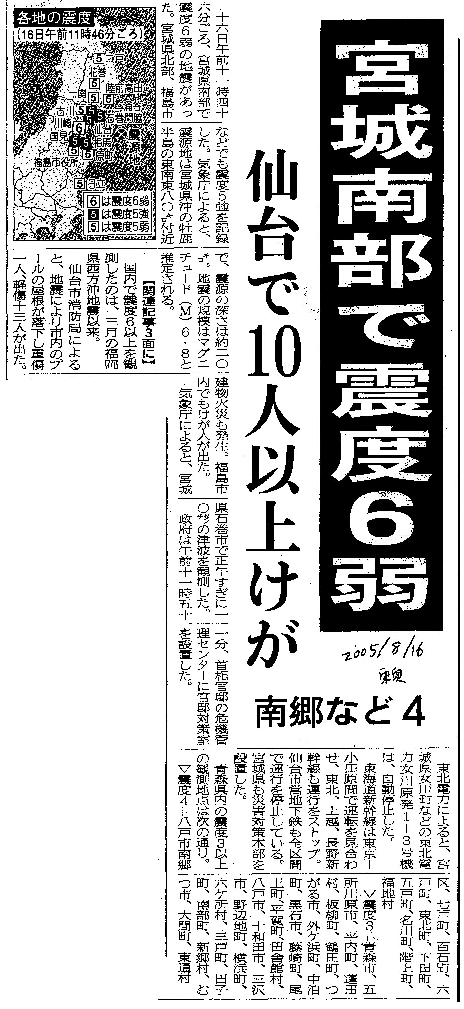 [2005_08_16_02]宮城南部で震度6弱 仙台で10人以上けが 南郷など4(東奥日報2005年8月16日)