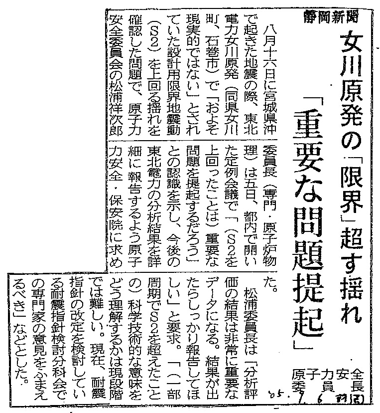 [2005_09_06_01]女川原発の「限界」超す揺れ 「重要な問題提起」 原子力安全委員長(静岡新聞2005年9月6日)