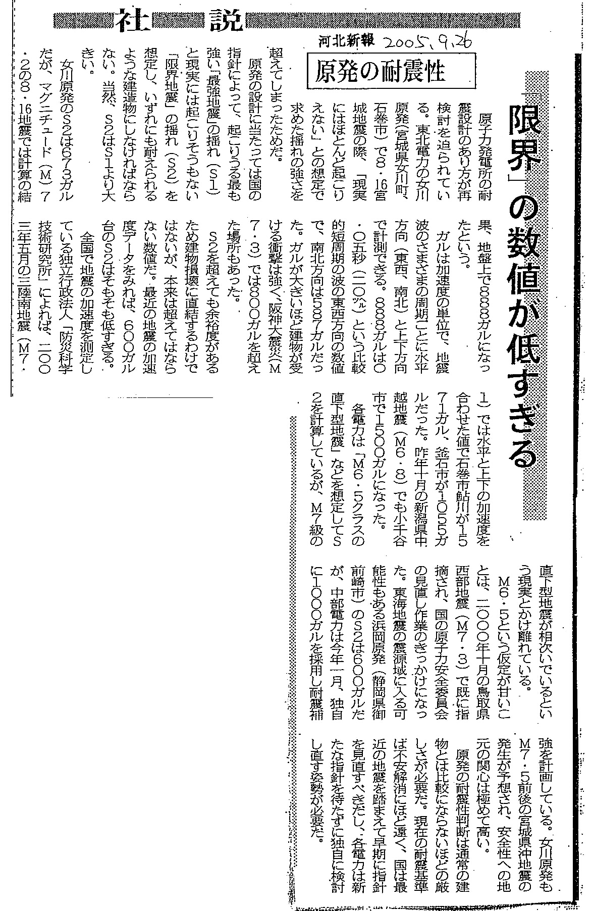 [2005_09_26_01]社説 原発の耐震性 「限界」の数値が低すぎる(河北新報2005年9月26日)