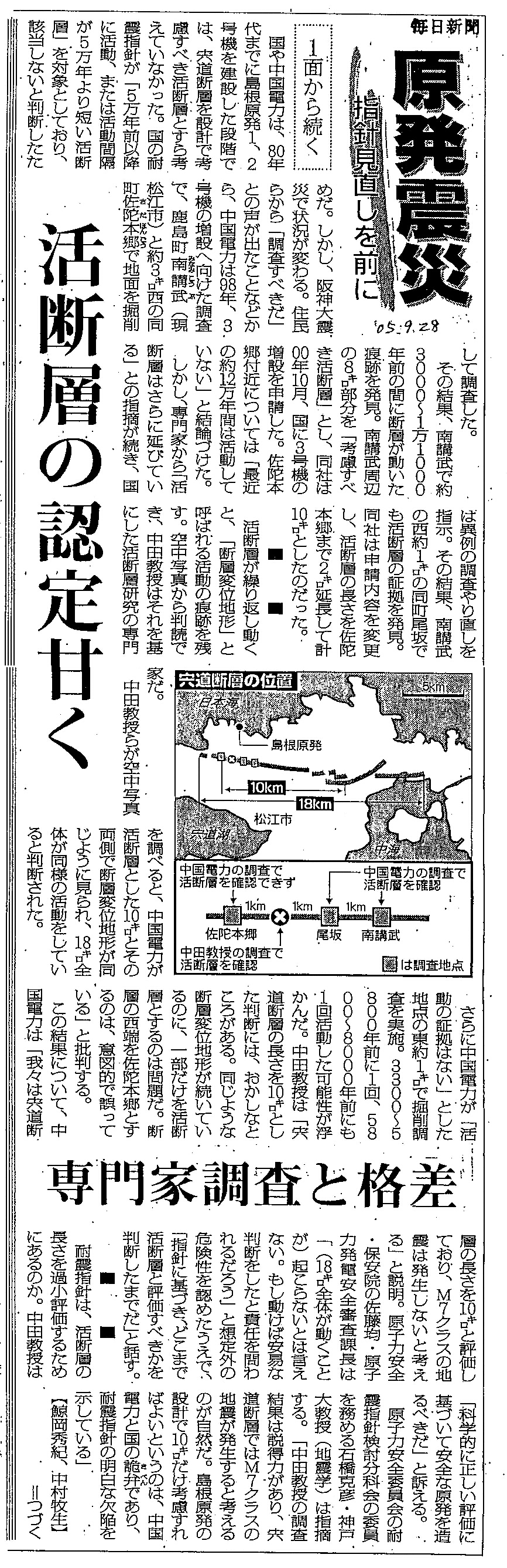 [2005_09_28_02]原発震災 指針見直しを前に 活断層の認定甘く 専門家調査と格差(毎日新聞2005年9月28日)