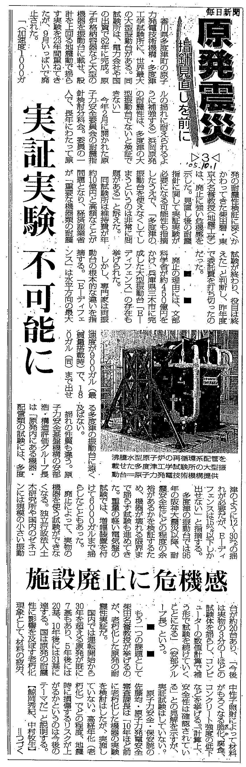 [2005_10_01_01]原発震災 指針見直しを前に 実証実験不可能に 施設廃止に危機感(毎日新聞2005年10月1日)