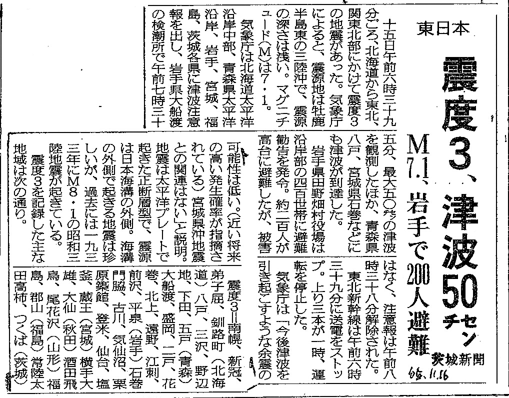 | [2005_11_16_01]東日本 震度3、津波50センチ M7.1、岩手で200人避難(茨城新聞2005年11月16日) |